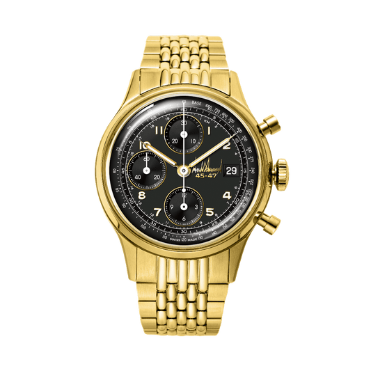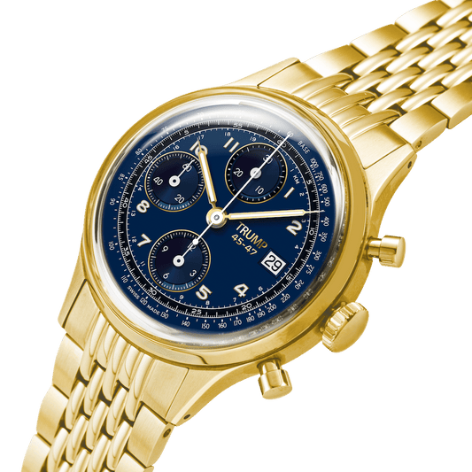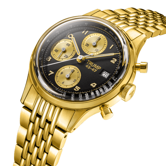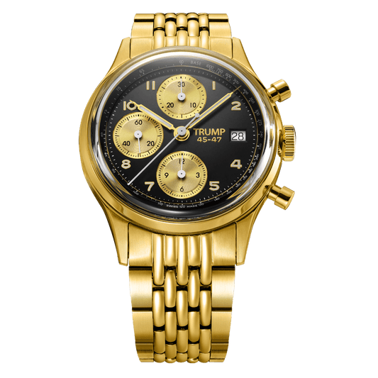 The Trump Racer Chronograph’s striking black-and-gold dial proudly features his iconic name embossed in gold, standing out against the jet-black background. The inscription "45-47" serves as a lasting tribute to President Trump’s legacy, commemorating his new role as the 47th President. This timepiece is a bold statement of admiration and support.