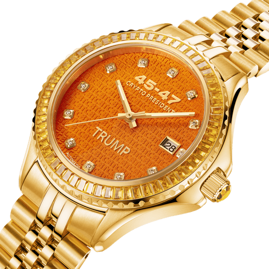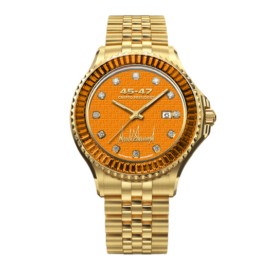 A strong statement of ambition and success, we’ve customized this limited edition version by adding 60 Orange Gems & a 12 VS1 Diamonds. A beautifully "BTC" Embossed Orange Dial was added - inspired by the President’s unwavering support for crypto!