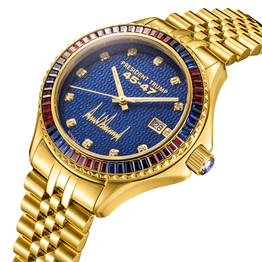 This Trump’s Ultimate Jewel watch features a custom embossed DJT print on a presidential-blue dial. Completed by 12 stunning applied VS1 DIAMOND indexes and 18 Karat GOLD plated Bracelet & Case. The final ULTIMATE touch is a Blue & Red Jeweled bezel.