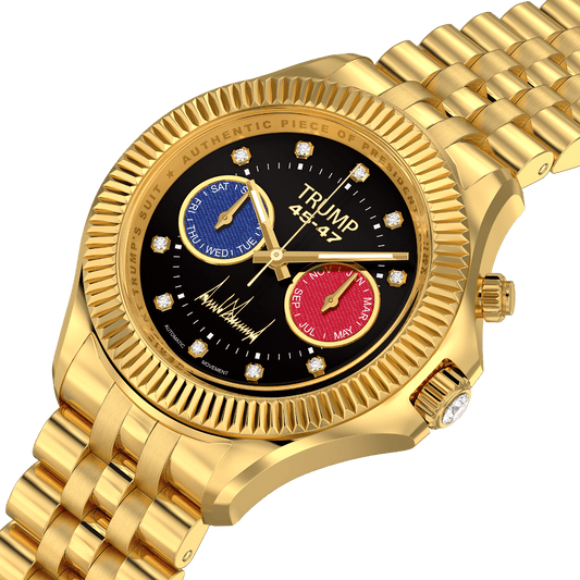 This limited edition Chronograph watch features TWO incredible pieces of US history. One sub-dial is set with an authentic piece of Trump's iconic blue Mugshot suit while the other one features a piece of red tie that he wore at the event. This double collector's item carries the weight of the President's immense fighting spirit: Fight Fight Fight!