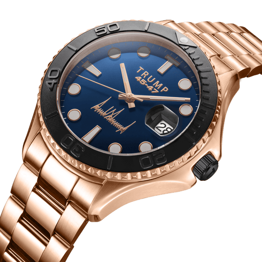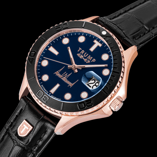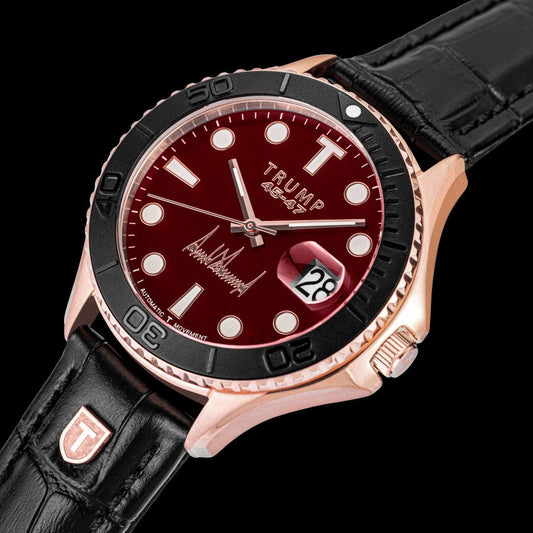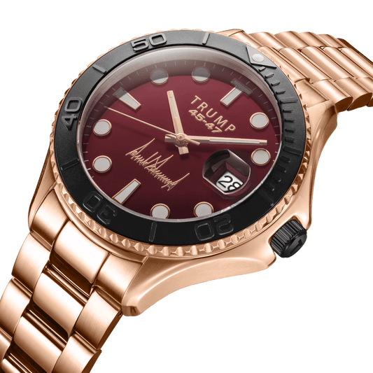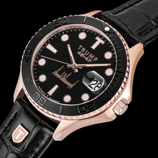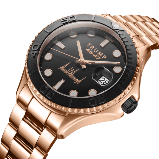 The Trump Warrior's 18K Rose Gold Plated Case & Bracelet work together to create an incredible feeling of luxury. With a Deployant Clasp for the strap, wearing this watch is an experience in of itself. A rare TRUMP shield, featuring the iconic "T," is placed onto the dial, an elegant way of displaying your support for the President.