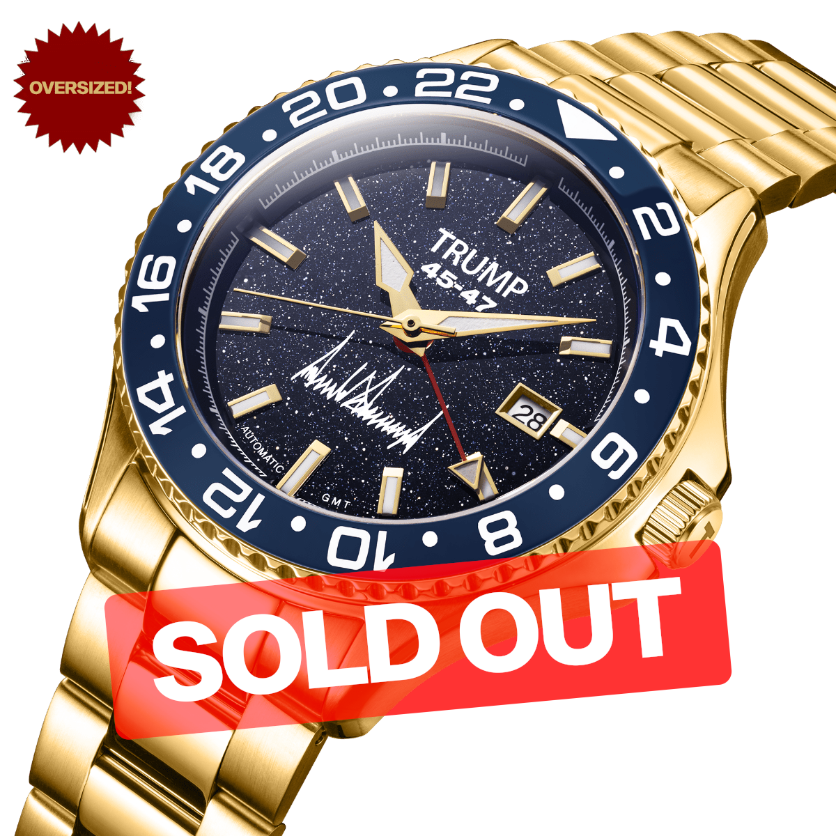 Key Features: - Oversized 45MM Case: Command attention with a bigger and bolder case size. - Dark Blue Aventurine Glass Dial: Inspired by President Trump's signature dark blue suits. - 18 Karat Gold Plating: Looks like you invested thousands and thousands in a status watch - TMI NH34 Movement with GMT 4th Hand: Keep track of two different timezones simultaneously. - Rotating 24-Hour Bezel: Functional and stylish, enhancing the watch's versatility. - Limited Edition: Each watch is individually numbered, making it a true collector's item, with only 500 ever in existence.