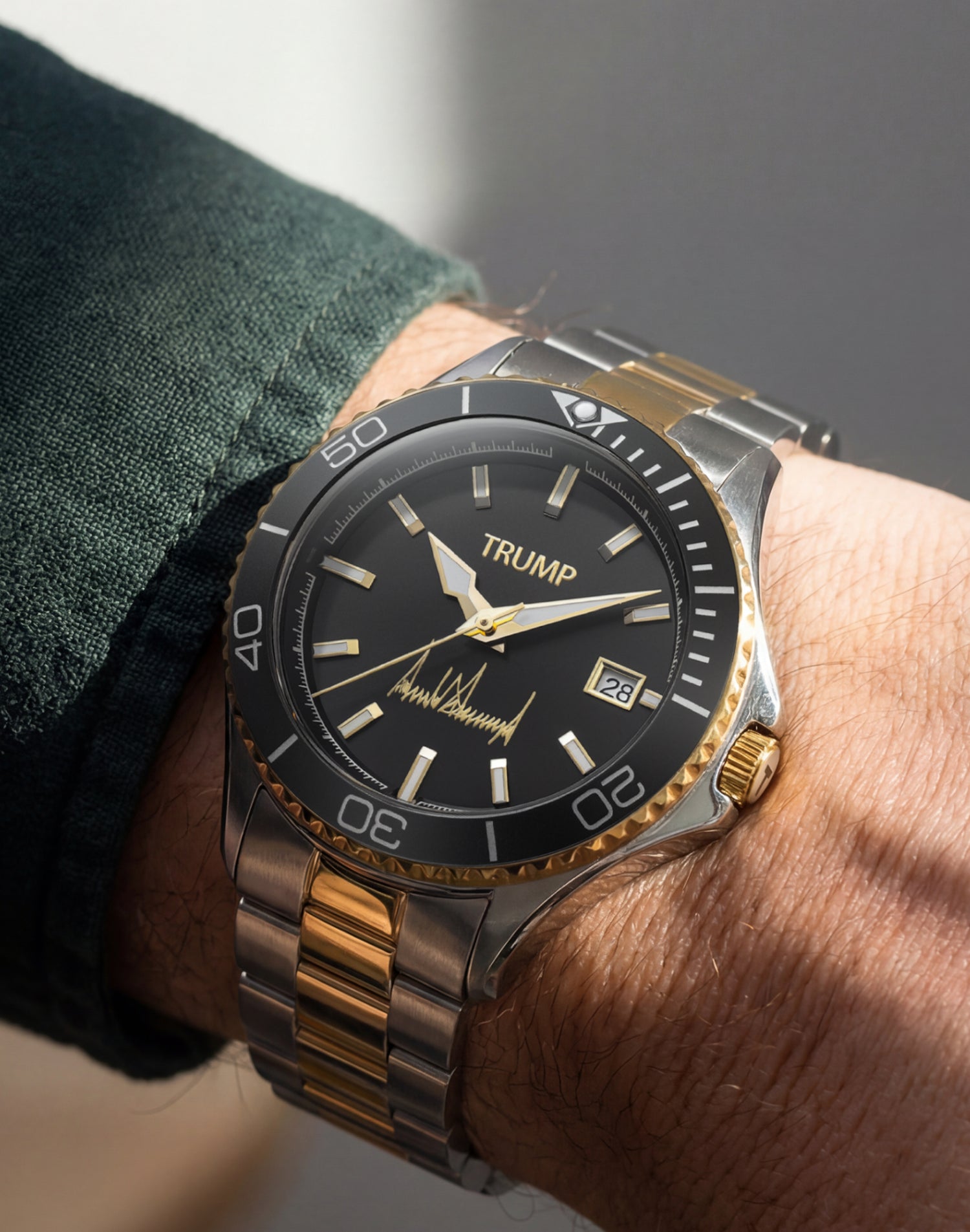 Designed in collaboration with the President, this black dial is embossed with his iconic signature & name in gold. A true statement of approval & support for the President.