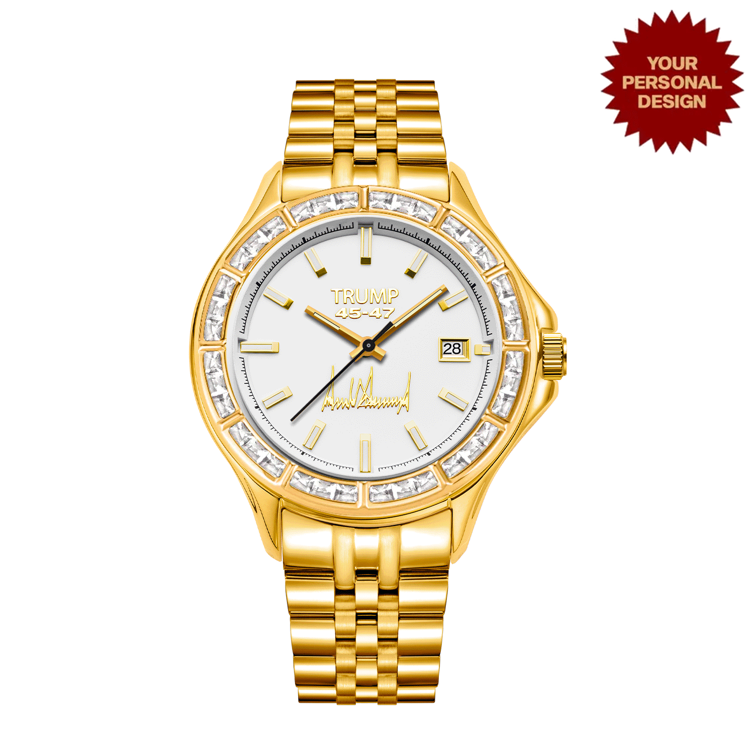 The latest LIMITED EDITION Customizable Trump Watch — a spectacular, fully customizable timepiece now in 18K Gold Plating, Jeweled Bezel & Stone Dials options.
